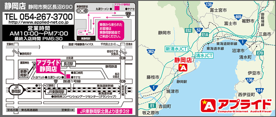 | アプライド静岡店 | 10:00~19:00 | 〒420-0813 静岡市葵区長沼690 | 054-267-3700 |