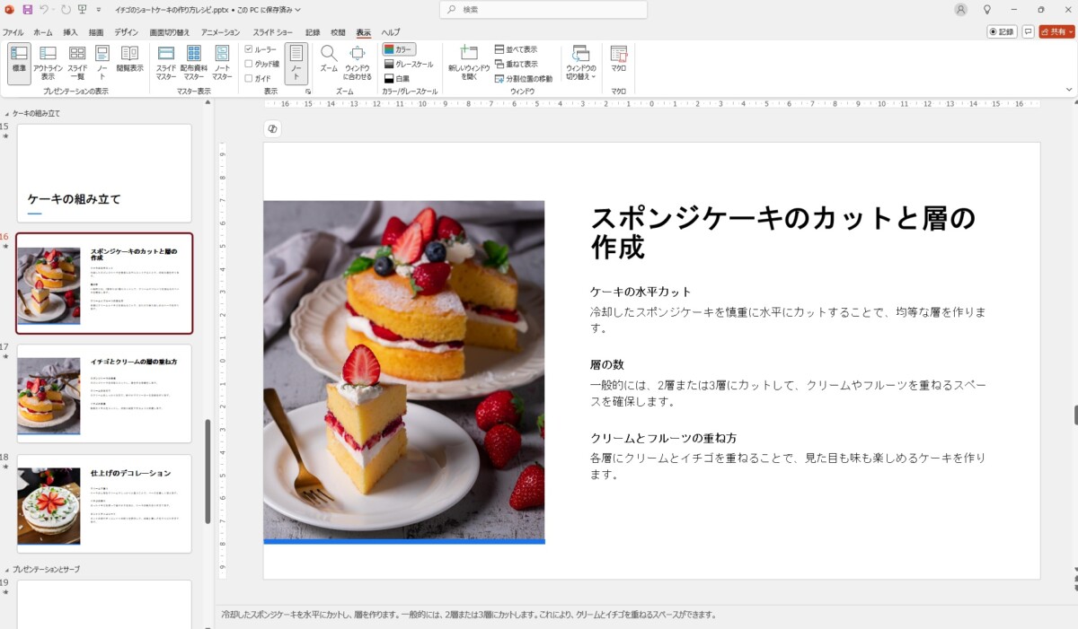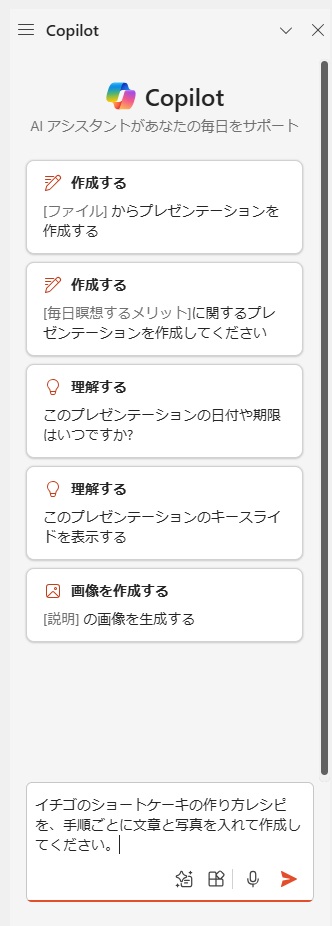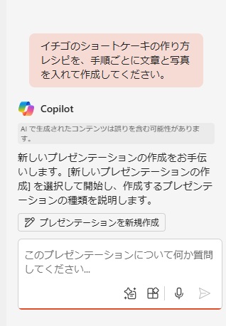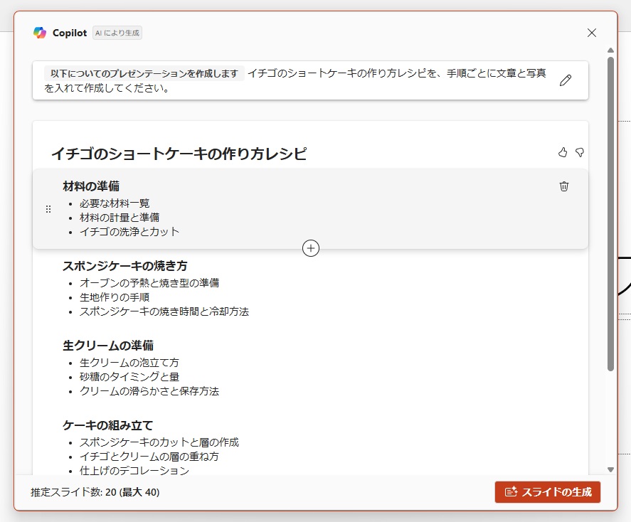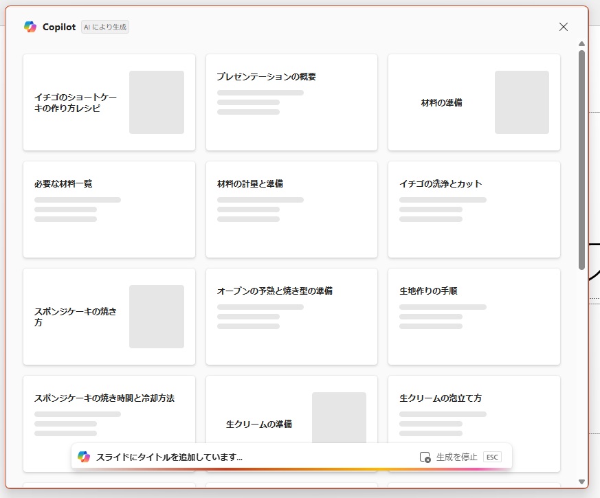 例として、PowerPointのCopilot ボタンから指示をして、レシピのスライドを自動生成させてみました。