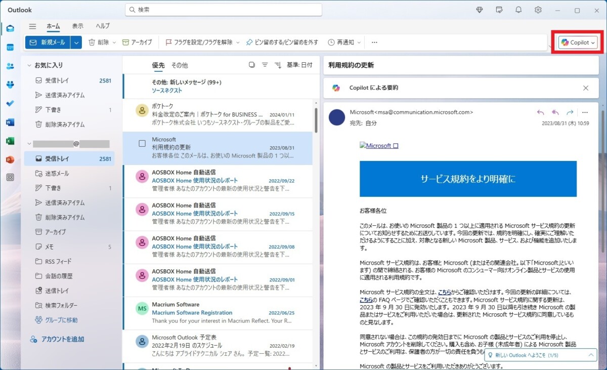 上記の内容でしたので、コールセンターによるリモート接続にて状況を確認した所、Outlook Classic の消失と、Copilotが追加されたOutlook(new)※有料版がインストールされていることを把握しました。
