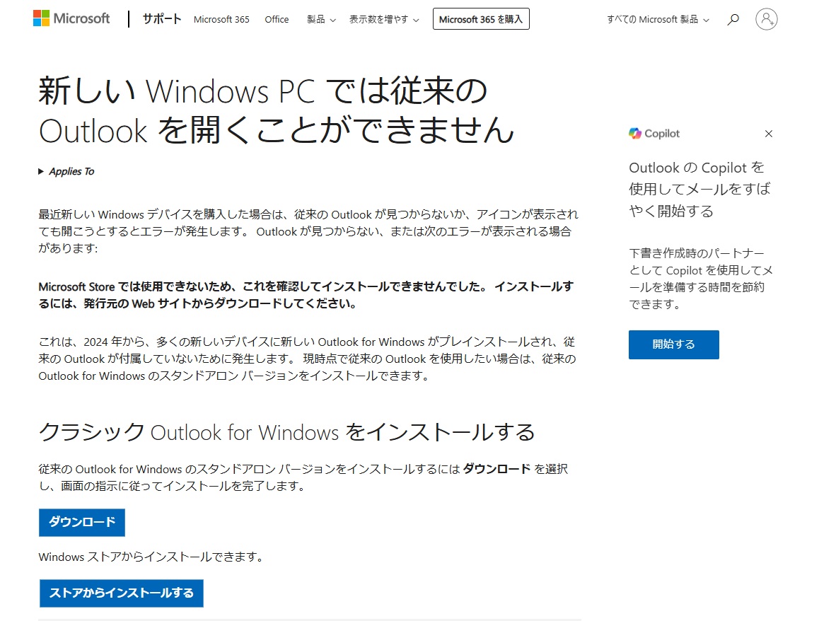 【参照】Microsoft公式サポートページ ”新しい Windows PC では従来の Outlook を開くことができません”