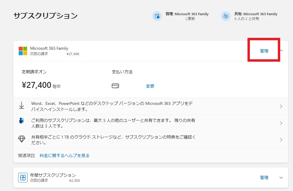 サブスクリプション画面で「管理」クリック