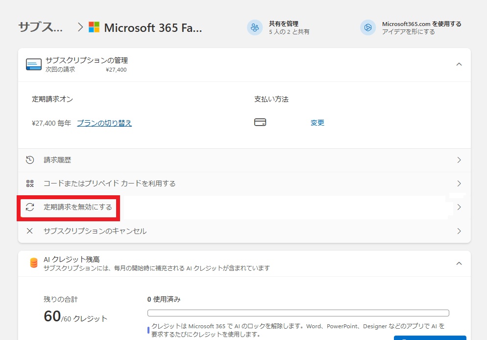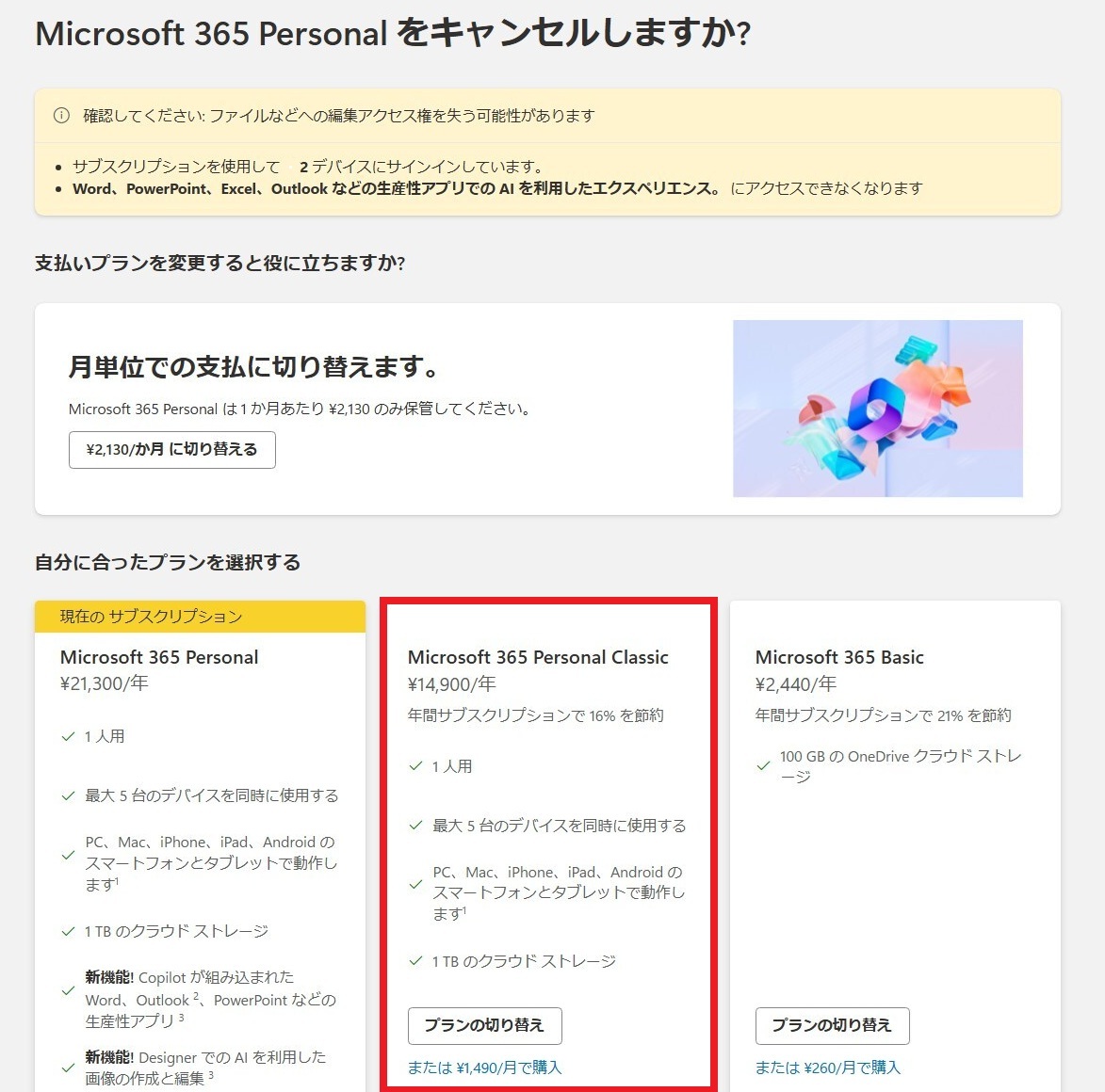 AI生成機能を利用しない場合は、「Microsoft365 Personal / Family Classic」に変更することで、値上げ前の価格で契約できます。