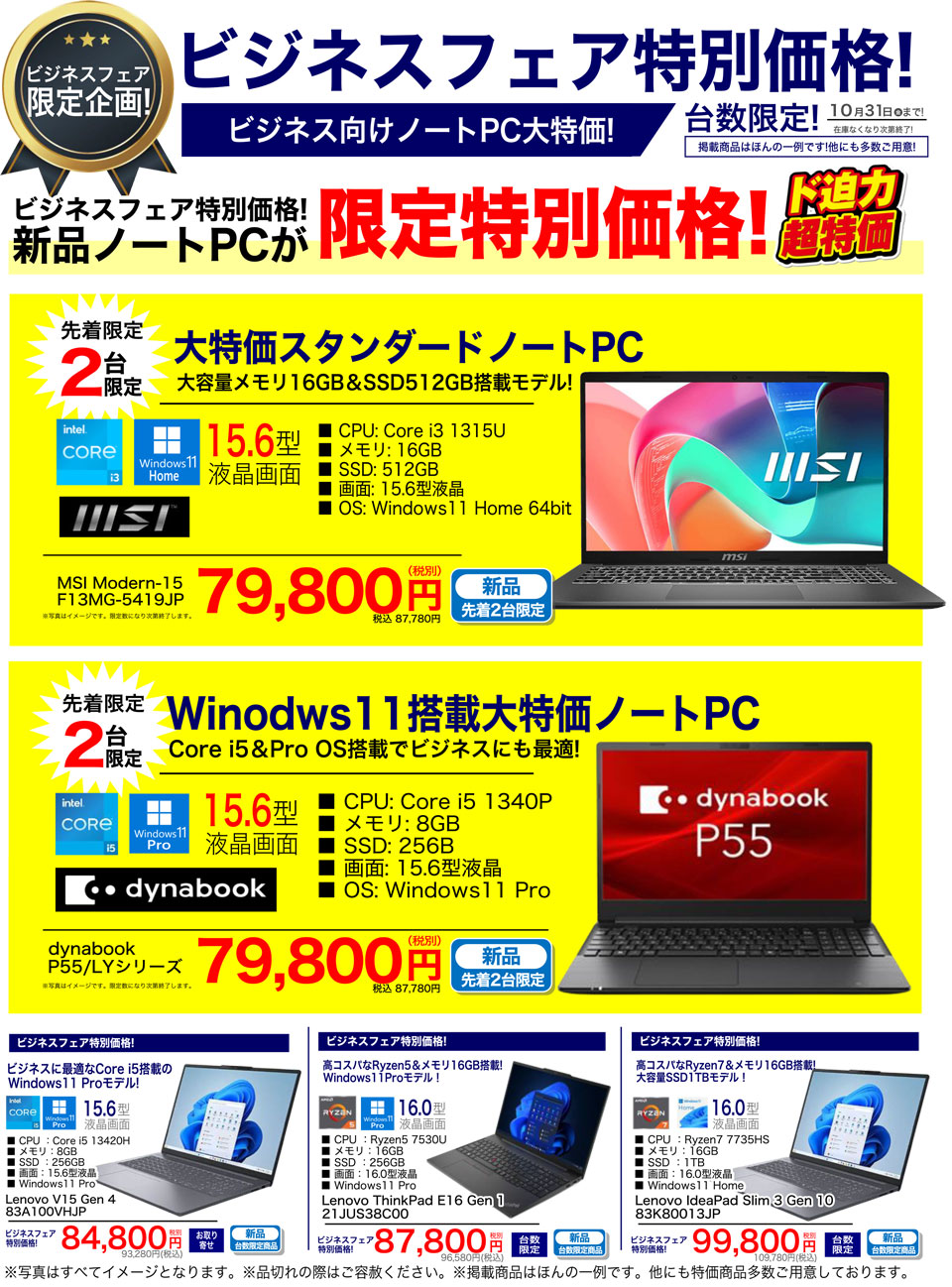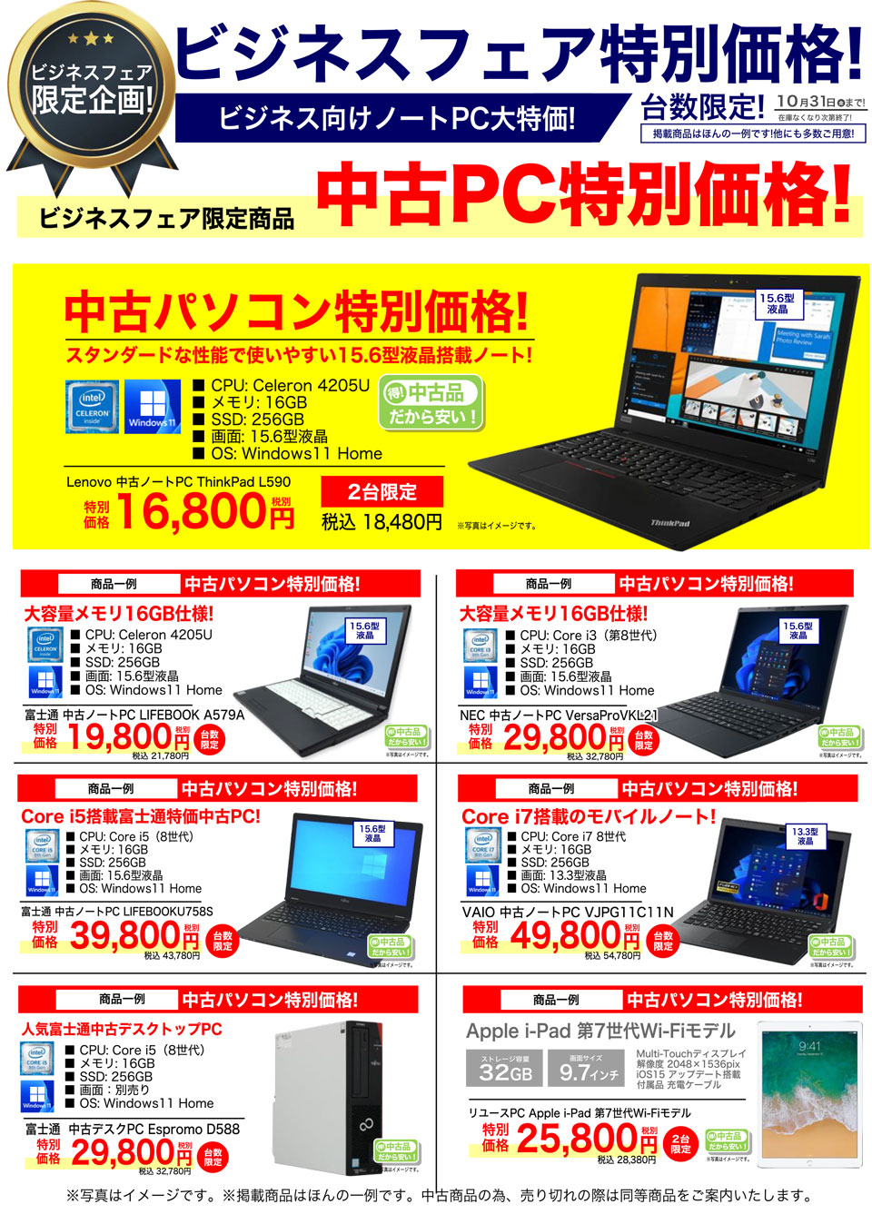 ビジネスフェア期間中は、ビジネス向けPC、中古PC等、様々な特価PCをご用意いたします!