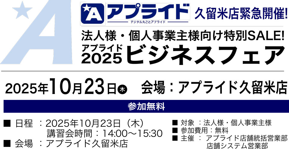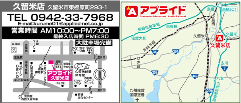 | アプライド久留米店 | 10:00~19:00 | 〒830-0003 久留米市東櫛原町293-1 | 0942-33-7968 |