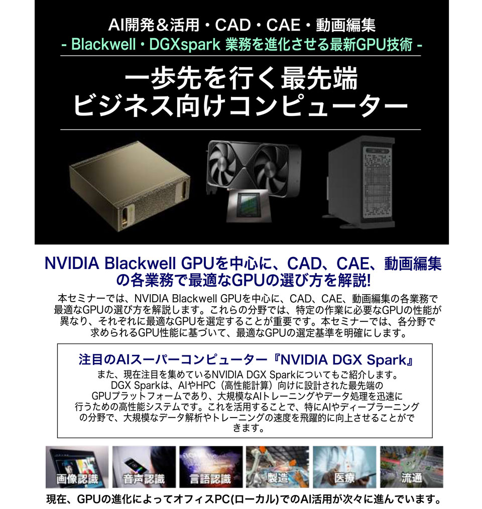 セミナーでは、GPUが業務に与える影響や、最適な選定基準、システム構成の方法について、