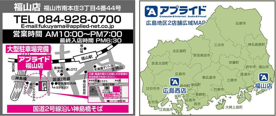 | アプライド福山店 | 10:00~19:00 | 〒720-0077 福山市南本庄3-4-44 | 084-928-0700 | |