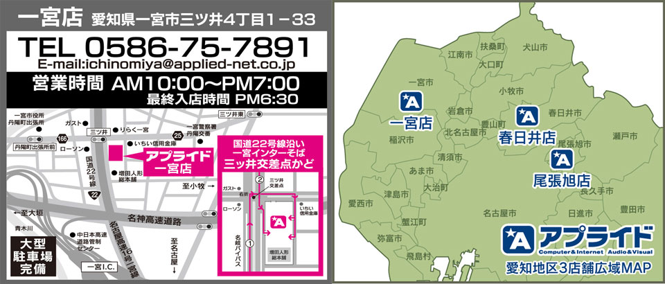 | アプライド一宮店 | 10:00~19:00 | 〒491-0827 愛知県一宮市三ツ井4-1-33 | 0586-75-7891 | |