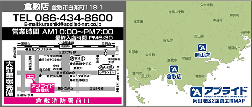 | アプライド倉敷店 | 10:00~19:00 | 〒710-0824 倉敷市白楽町118-1 | 086-434-8600 |