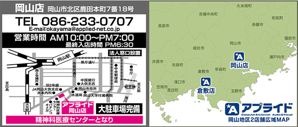 | アプライド岡山店 | 10:00~19:00 | 〒700-0915 岡山市北区鹿田本町7-18 | 086-233-0707 | |