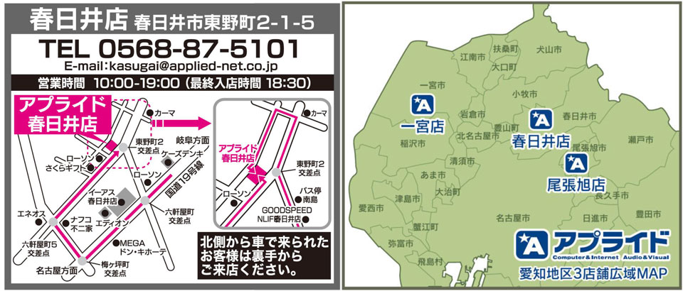 | アプライド春日井店 | 10:00~19:00 | 〒486-0817 愛知県春日井市東野町 2-1-5 | 0568-87-5101 | |