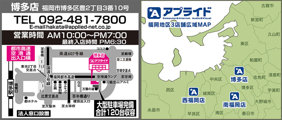 | アプライド博多店 | 10:00~19:00 | 〒812-0042 福岡市博多区豊2-3-10 | 092-481-7800 | |