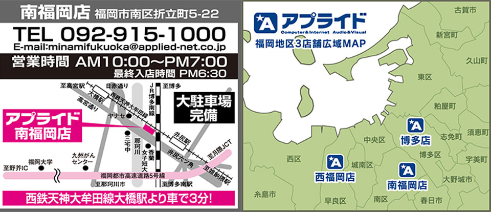 | アプライド南福岡店 | 10:00~19:00 | 〒811-1303 福岡市南区折立町5-22 | 092-915-1000 | |