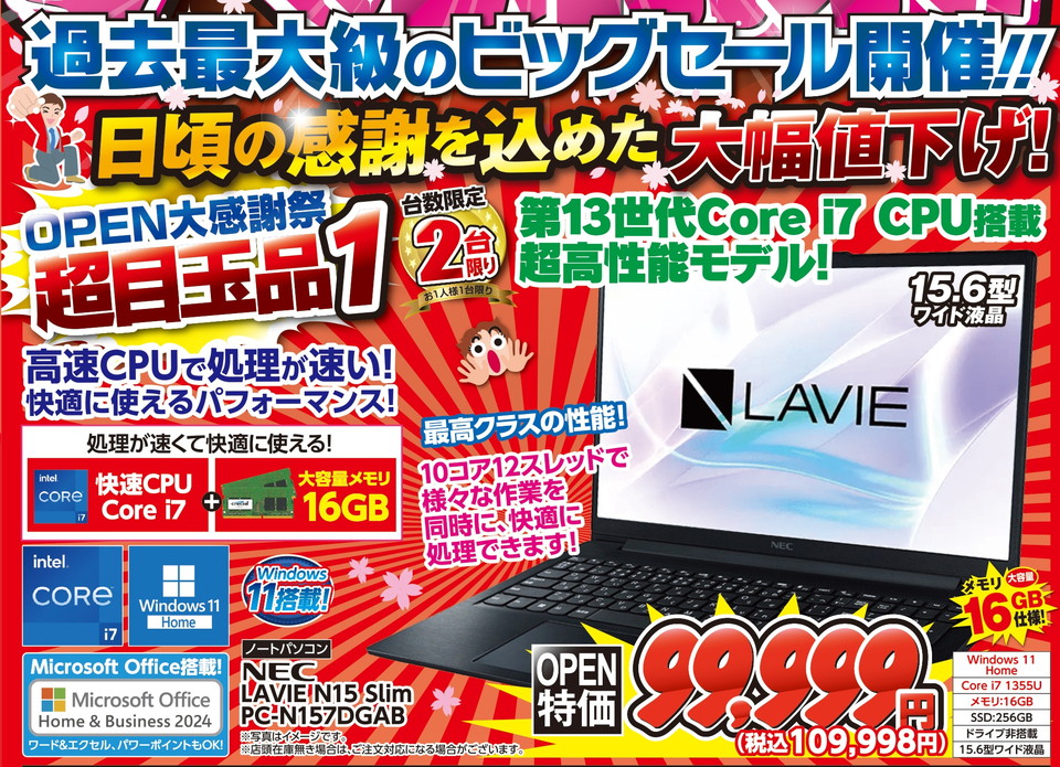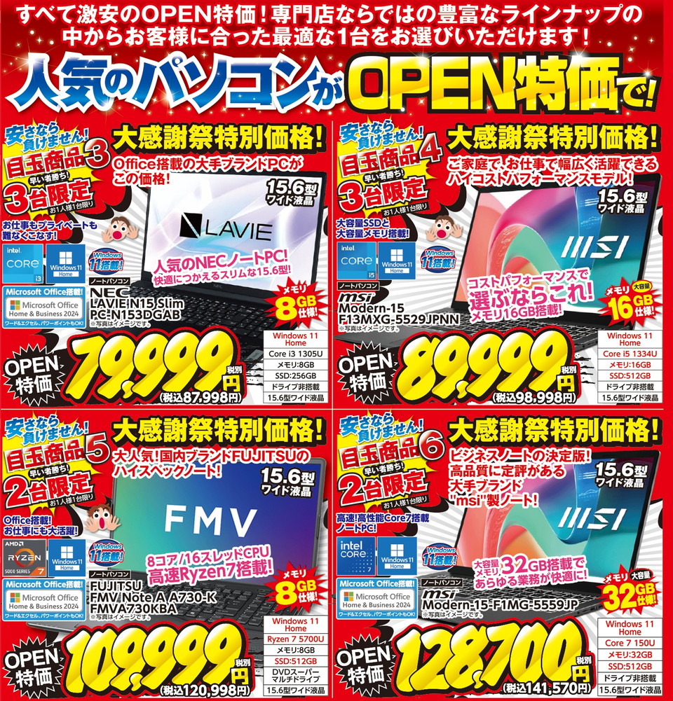 新品ノートパソコンOPEN大感謝祭特価!