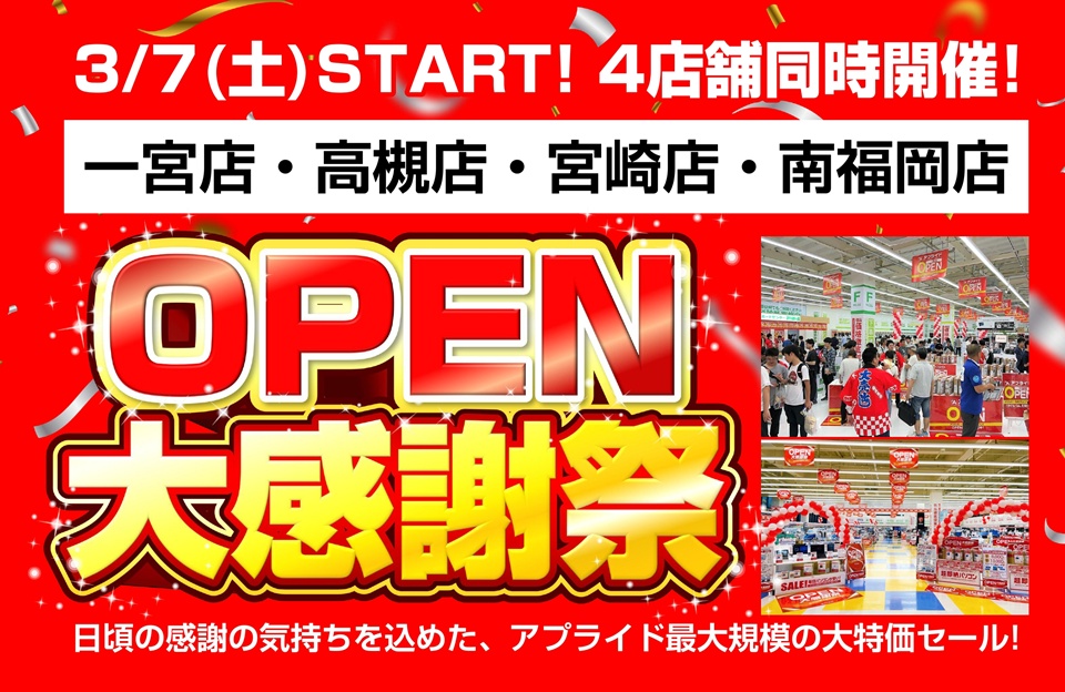 【4店舗同時開催!】年に一度の大幅値下げ!『アプライドOPEN大感謝祭』開催!